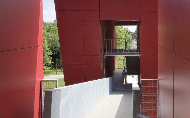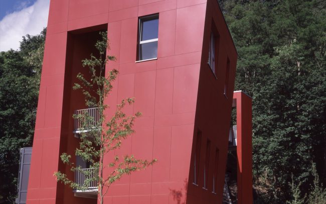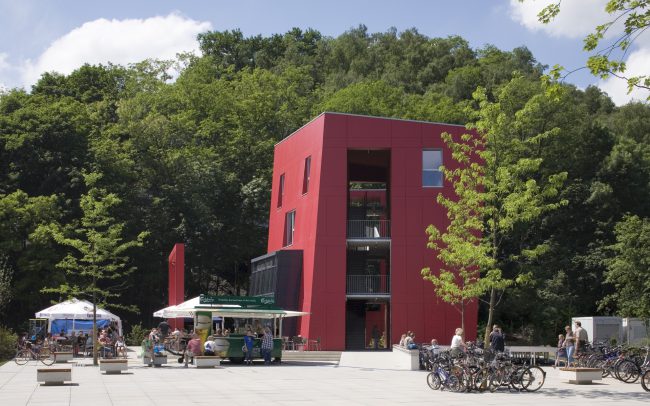 Im Rahmen der städtebaulichen Umnutzung des Zechengeländes „Carl-Alexander“ wurde das 4-geschossige Gebäude am Fuße der ehemaligen Abraumhalde errichtet. Der Entwurf sieht zwei voneinander getrennte Gebäudeabschnitte vor, die durch ein zentral liegendes Treppenhaus verbunden werden. Die Grundfläche des Turmes besteht aus zwei ungleichmäßigen Trapezen und der zentral liegenden rechtwinkligen Treppe, die zu den gegenüberliegenden Gebäudeschmalseiten offen ausgebildet ist. Der Neubau nimmt Nutzungen aus dem Bereich Gastronomie, Ausstellung, Atelier- und Kunstarbeiten sowie eine Wohnung auf. Das Bergfoyer wird über den Zwillingsturm mit dem Schwebesteg verbunden.