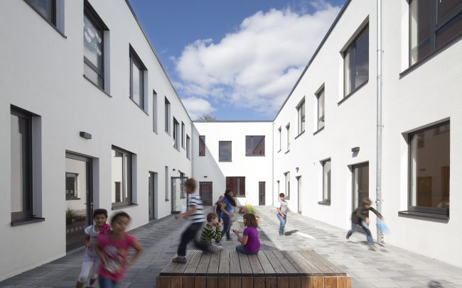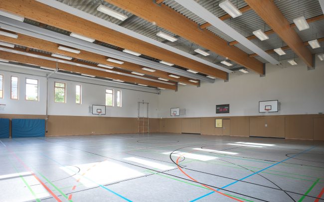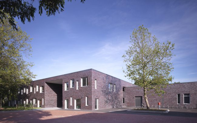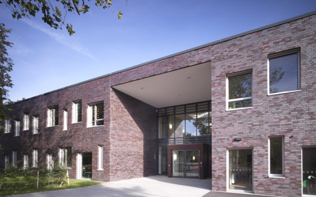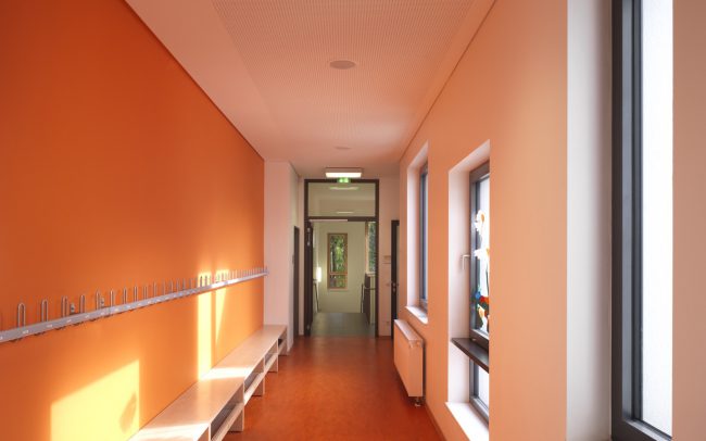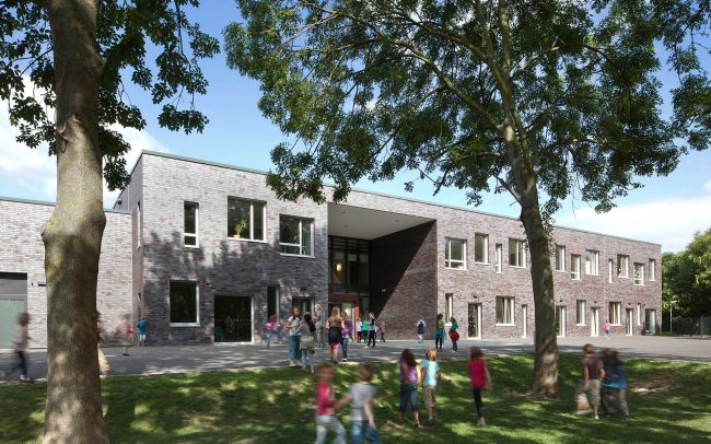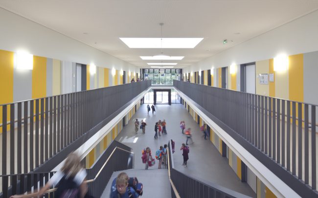 Der Neubau ist als Solitärbau Teil des bestehenden Schulzentrums, Grundschule und Mehrzweckhalle sind direkt ablesbar. Alt- und Neubau bilden ein Ensemble ohne, dass die eigenständigen Charakteristika der einzelnen Gebäude verloren gehen. Die Grundschule ist als kompakter kubischer zweigeschossiger Baukörper konzipiert. Prägende Gestaltungselemente sind die zentrale Erschließungshalle, die gleichzeitig das Forum beinhaltet und der Innenhof. Eine Galerieaufweitung bietet Platz für einen offenen Sitzbereich mit Blick auf das schulische Leben. Rund um den Luftraum des Forums ermöglichen Verglasungen in der Fassade Blickbezüge.