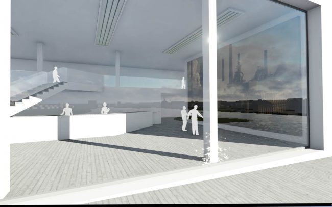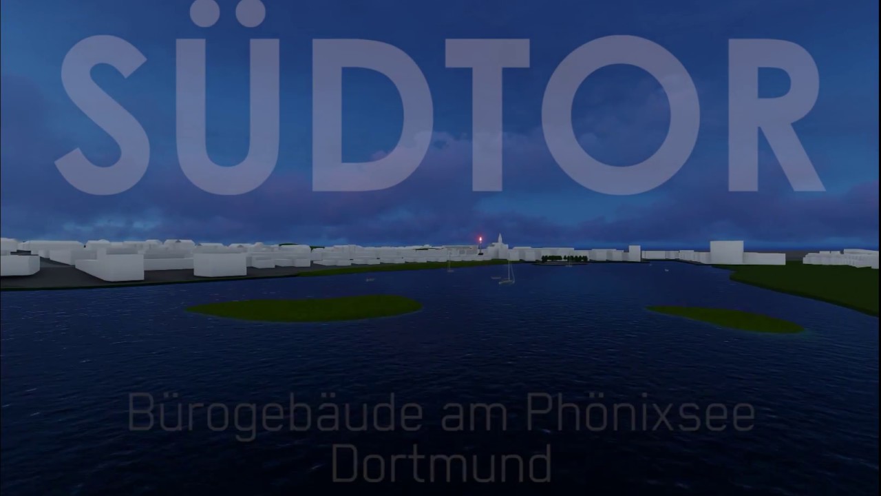 Kennzeichnend für den Entwurf ist die Verbindung der Themen „Städtebauliche Identität des Ortes mit Vorplatz und Fackel“ und „Ausprägung eines klaren kräftigen Abschlussgebäudes an der Hermannstraße“. Die Wechselwirkung dieser beiden Themen ist auf dem Vorplatz für alle erlebbar. Auf dem Südtor-Grundstück wird die Spannung der umgebenden Straßenräume gebündelt und in einem städtebaulichen Knotenpunkt als Freifläche für das Gebäude inszeniert. In Assoziation zu einer übergroßen Stadtleuchte wird hier die im Jahre 2004 abgerissene Hörder Fackel in einer modernen kunstvollen Interpretation an dieser Stelle neu installiert (Laserlicht/ Wasserkunst). Die Besonderheit des Grundstückes als Entreé zum gesamten Seegebiet wird damit weithin sichtbar dokumentiert. Mit diesem Objekt entsteht eine interessante Wechselwirkung über den öffentlichen Vorplatz hin zum nun markanten Südtor-Gebäude. Damit wird dem Gebiet der entsprechende Auftakt, bzw. der Hörder Bach-Allee der Abschluss gegeben. Das Zurücktreten des Gebäudes vom Straßenraum mit Inszenierung der „Hörder-Fackel“ ist eine respektvolle Geste vor der Stahlbau-Historie des Ortes Hörde. Die Geländetopografie kann geschickt für die Treppenanlage hinauf zum Gebäudehaupteingang genutzt werden (Treffpunkt Fackeltreppe). Bis auf einige Sitzbankmöbel wird auf Platzmöblierung verzichtet um die Gesamtwirkung des Südtorhauses zu steigern. Der Innenhof im rückwärtigen Grundstücksbereich staffelt sich mit den Dachterrassen nach oben und bildet einen Lichttrichter. Das Wasserbecken mit 3cm Wassertiefe und seinen bewegten Reflektionen macht den Innenhof zu einem lichtdurchfluteten Erlebnisraum. Soundmasking zum benachbarten Parkhaus. Die skulpturale Architektursprache in Weißbeton unterstreicht den werthaltigen, modernen Bürostandort in Dortmund-Hörde. Große fast bodentiefe Fenster erzeugen helle moderne Büroräume und unterstützen ein freundliches Arbeitsklima. Der Entwurf bildet durch seine Architektur eine Signifikanz mit hohem Wiedererkennungswert. Die anthrazithfarbenen Fenster unterstützen die Lochfassadenwirkung von außen und bilden als Holz/Alu-Konstruktion im Inneren den warmen Gegenpol zur Weißbetonfassade Klinkerfassade. Das Materialkonzept soll in besonderer Weise das Architekturkonzept unterstützen: Vorplatz: Lava-Stein, geschliffen. EG Fußboden Eingangshalle/ Konferenz: Lava-Stein poliert, Fassade: Weißbeton (Weißasche), Fackel mit Wasserkunst und Lichteffekten zu besonderen Anlässen.